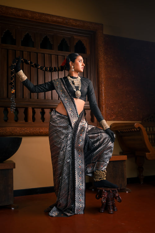 A masterpiece of Rankat Katan Silk, where colors blend like a sunset on fabric, woven with the elegance of Banaras.