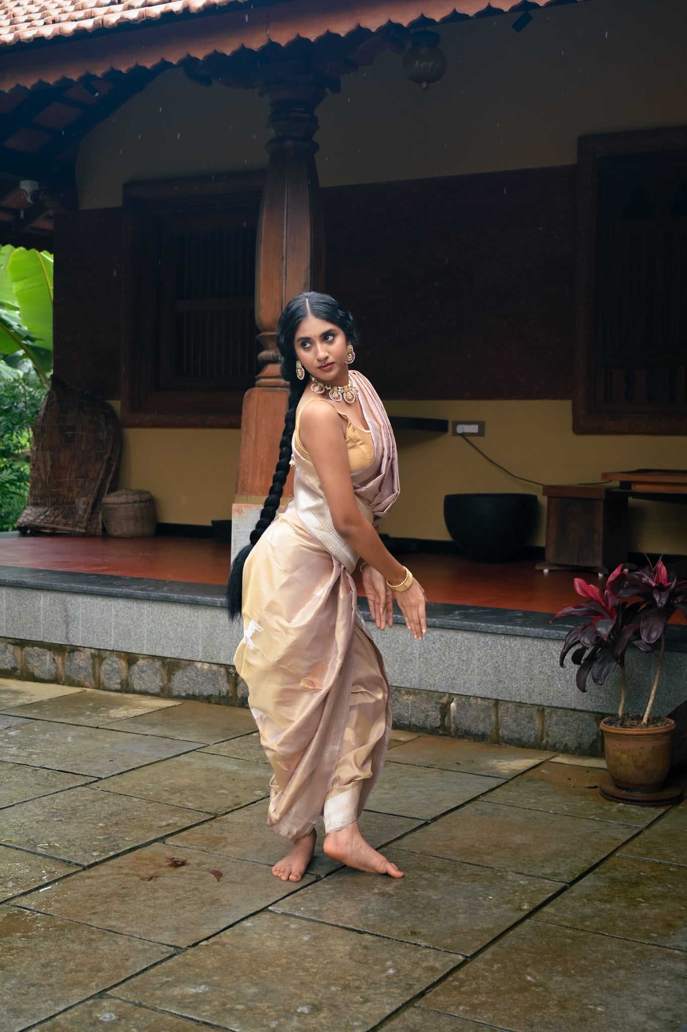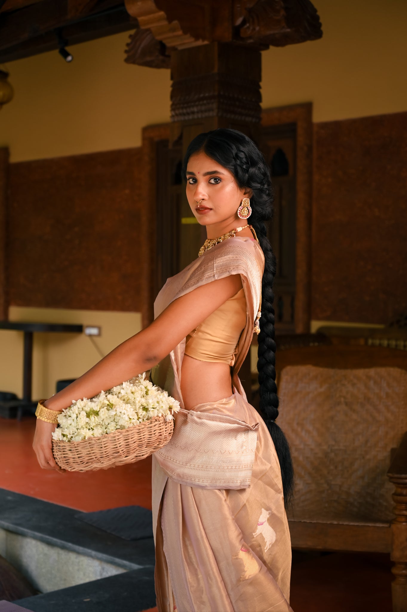 Handwoven tissue silk with kadwa craftsmanship Soft gold glow inspired by temple mornings Meenakari detailing that feels like jewellery woven into silk Elegant timeless and pure heritage energy