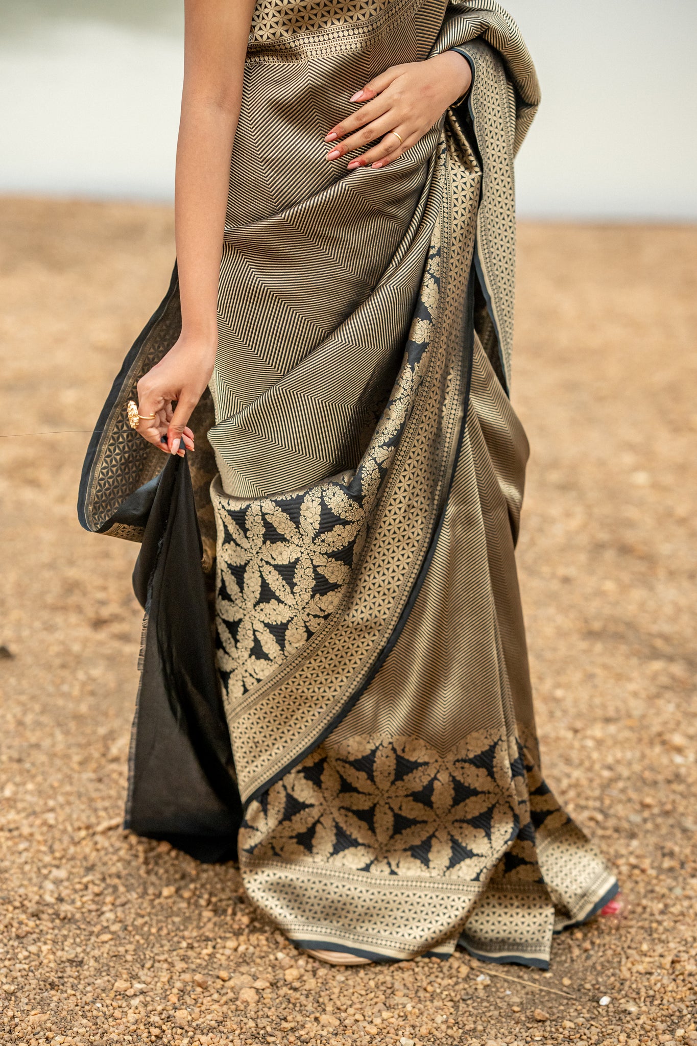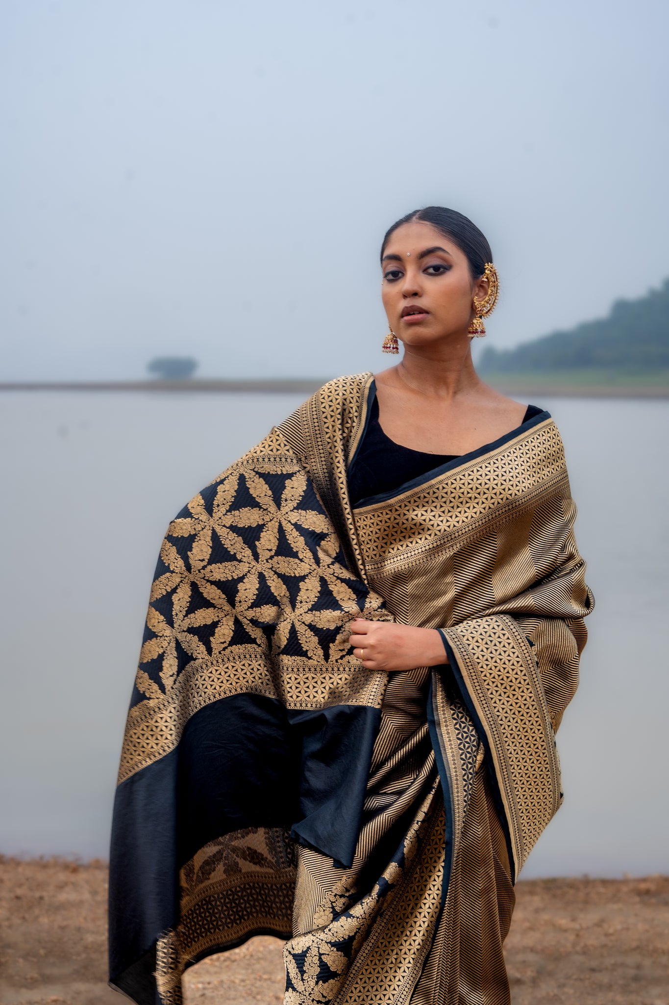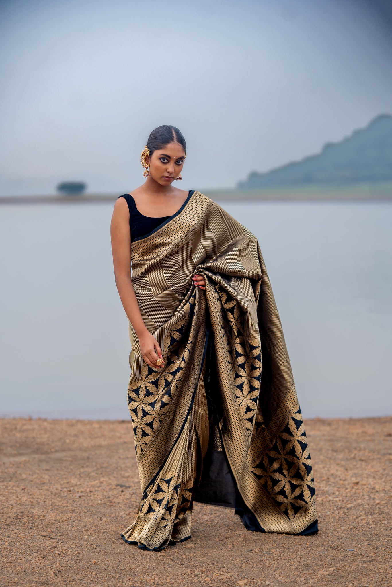 Black that refuses to fade, gold that refuses to dim. The Enakshi Midnight Rebel is restraint and rebellion draped in silk.