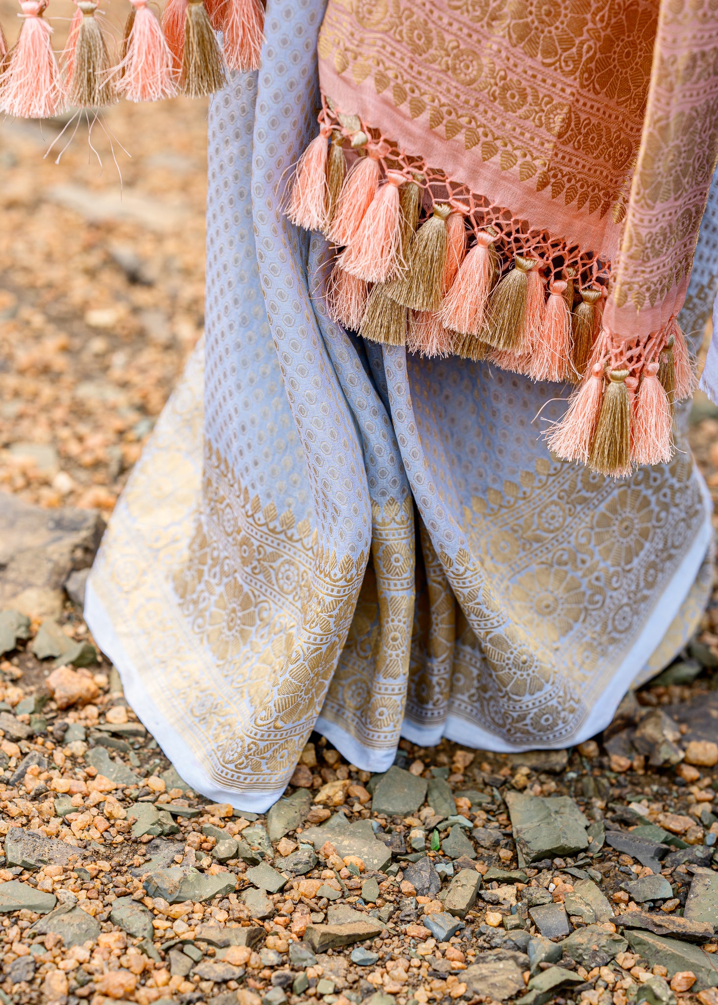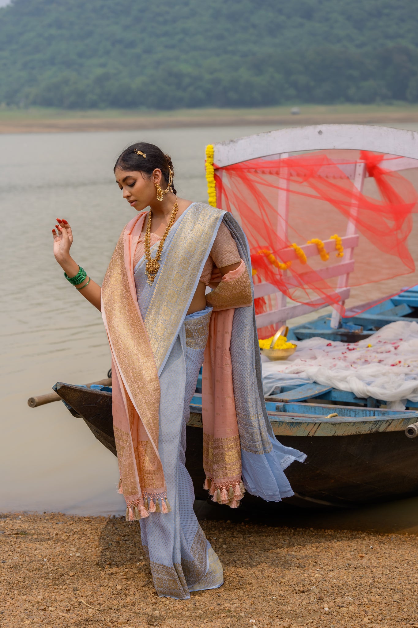 Soft as a river breeze, the Enakshi River Whisper in ice blue with a peach border is understated grandeur, eternal and serene.