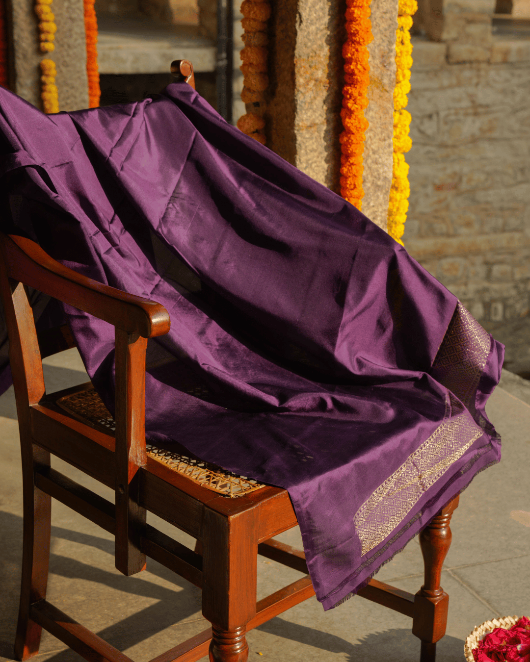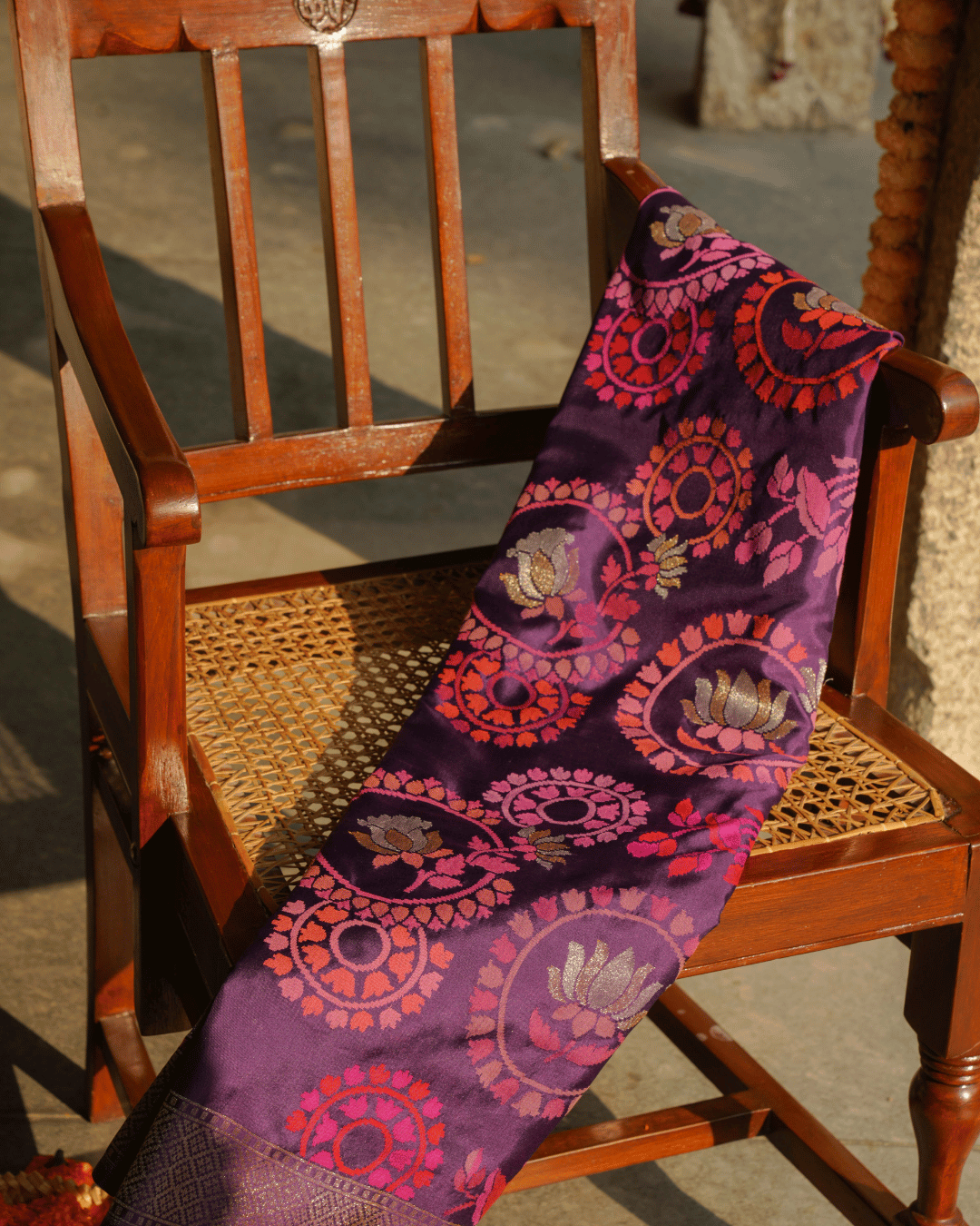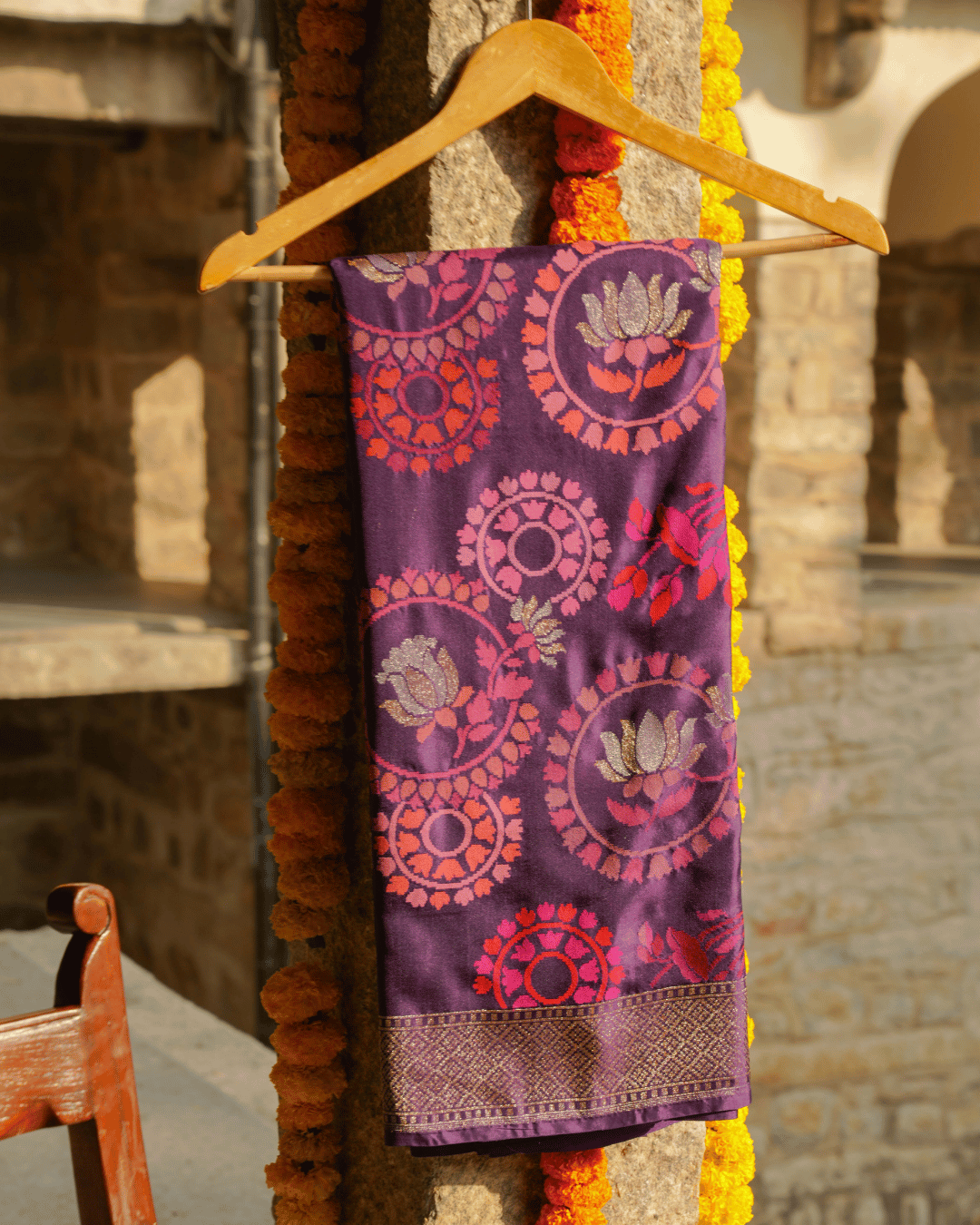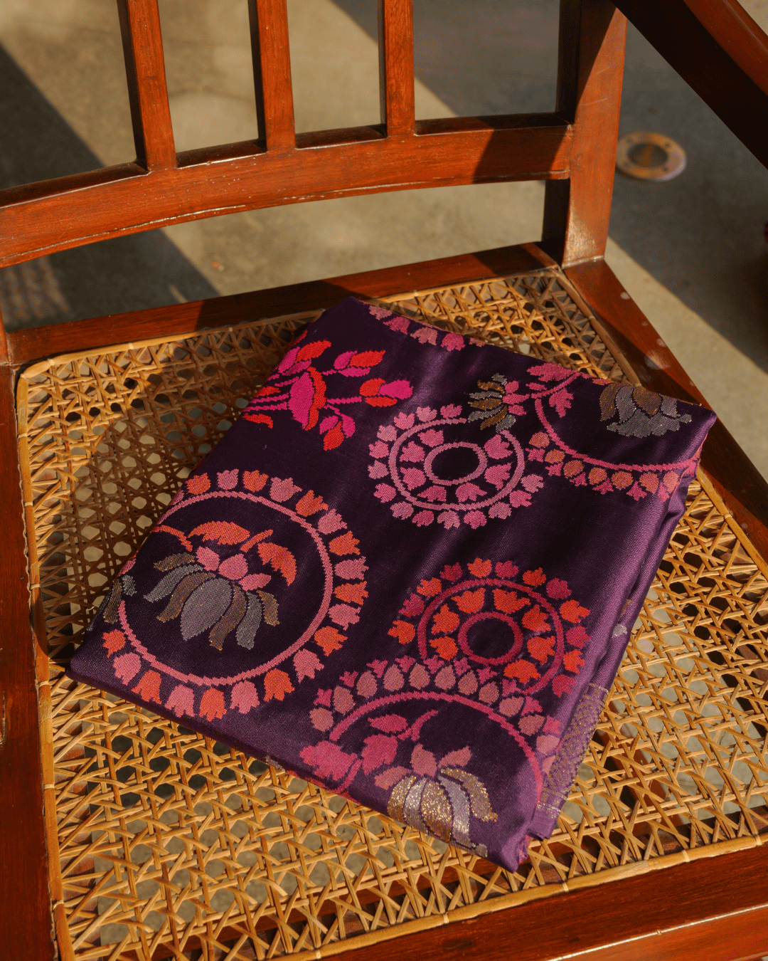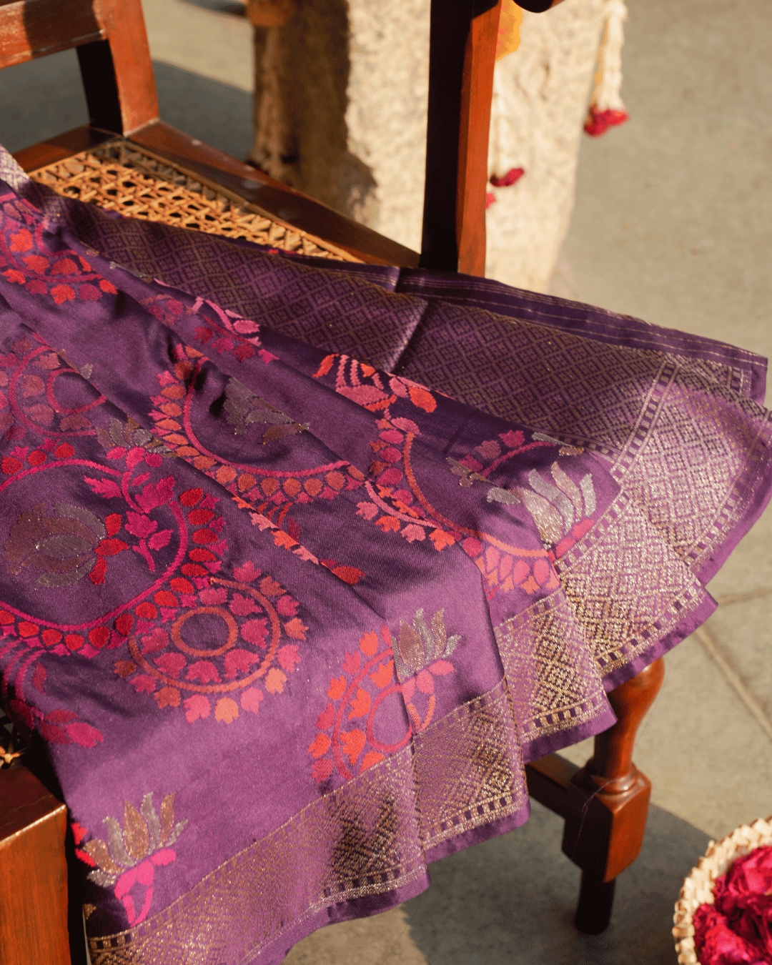 A royal purple Jamdani silk saree featuring detailed Meenakari artistry and genuine silver zari. The lustrous drape and fine weaving make it ideal for festive and evening occasions.